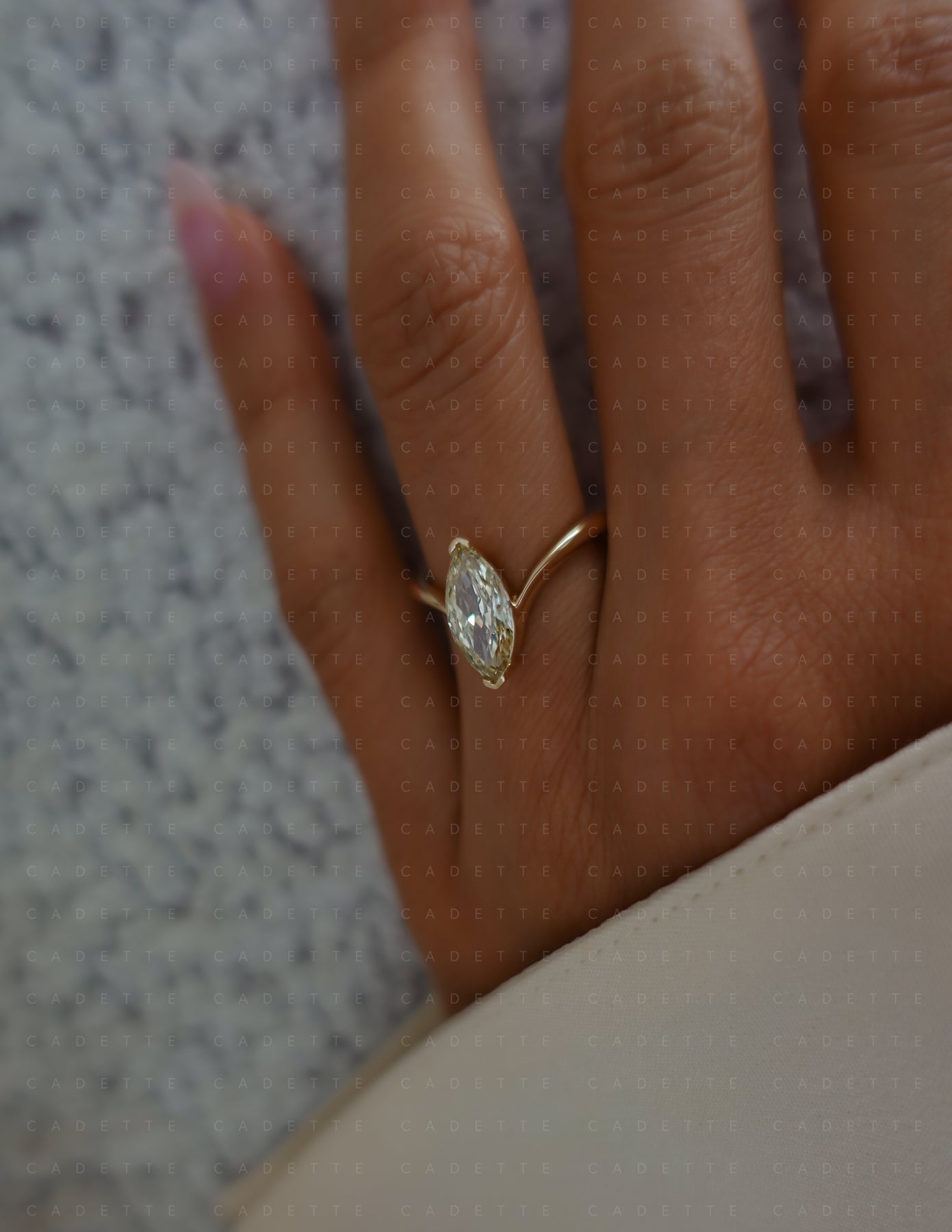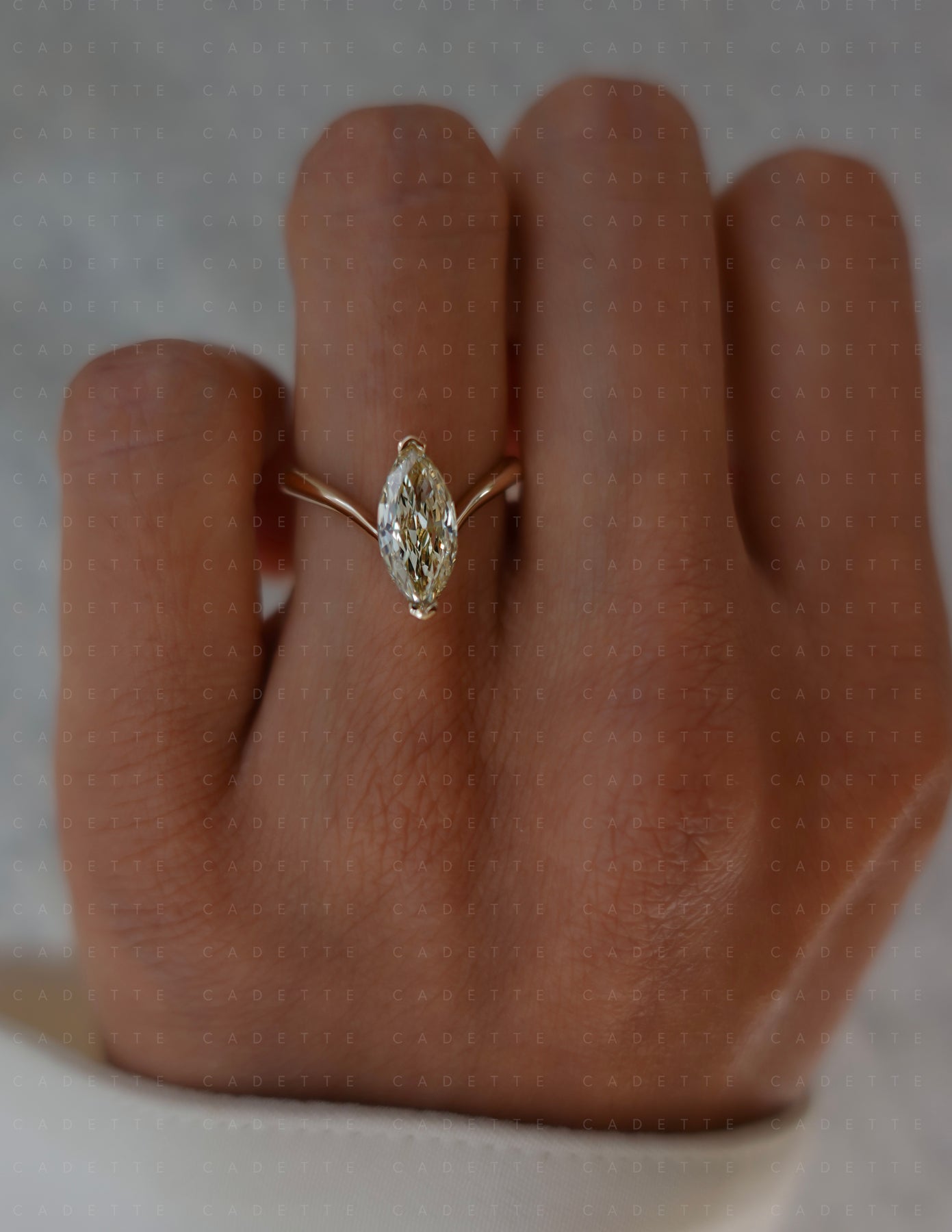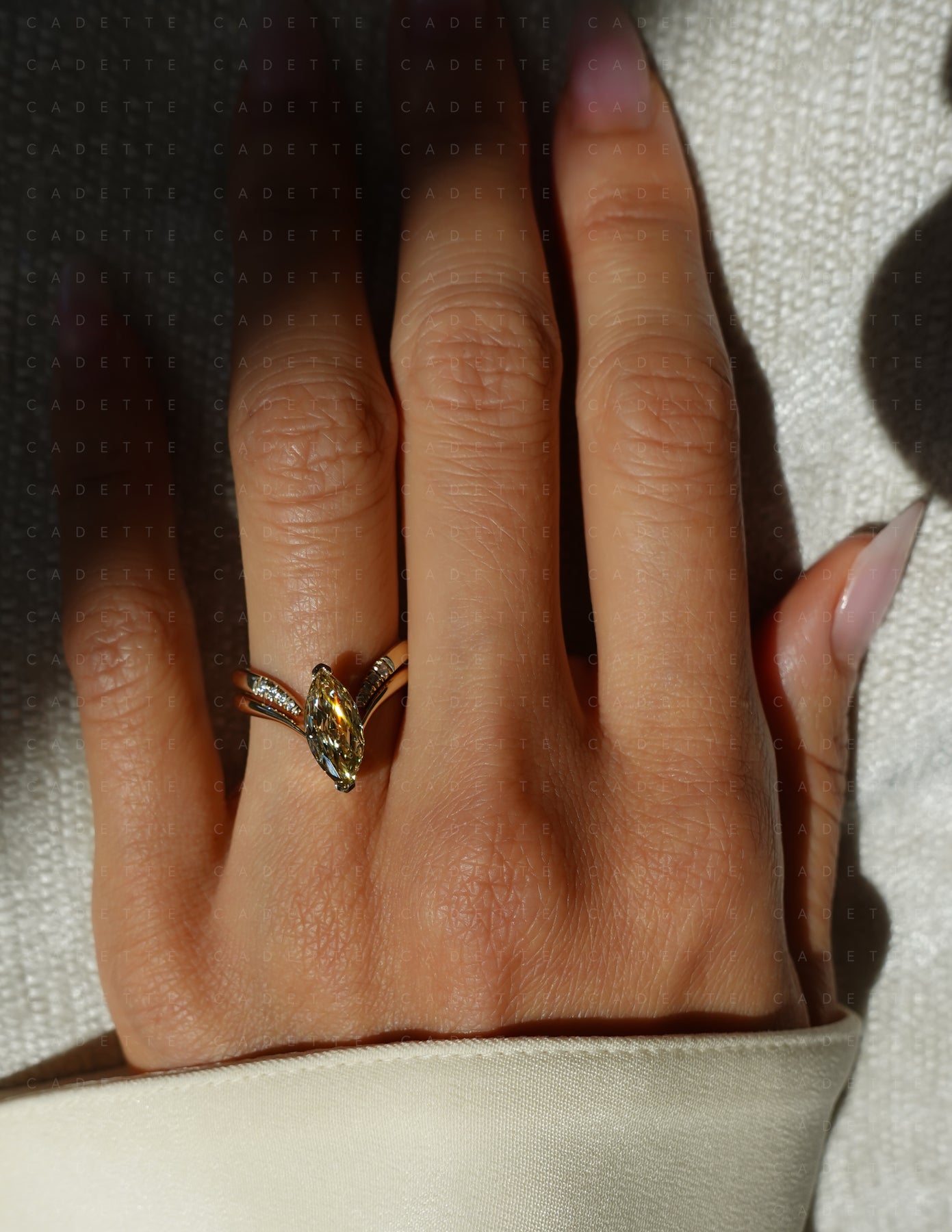 This one-of-a-kind Grande Marquise EVE Ring embodies harmony, rarity, and romance. At its heart lies an exceptionally rare 1.62ct champagne-hued marquise lab grown diamond — a golden tone that radiates warmth and individuality. The arching arms of the band gracefully draw the eye toward the diamond, emphasizing its elongated brilliance and sculptural elegance.