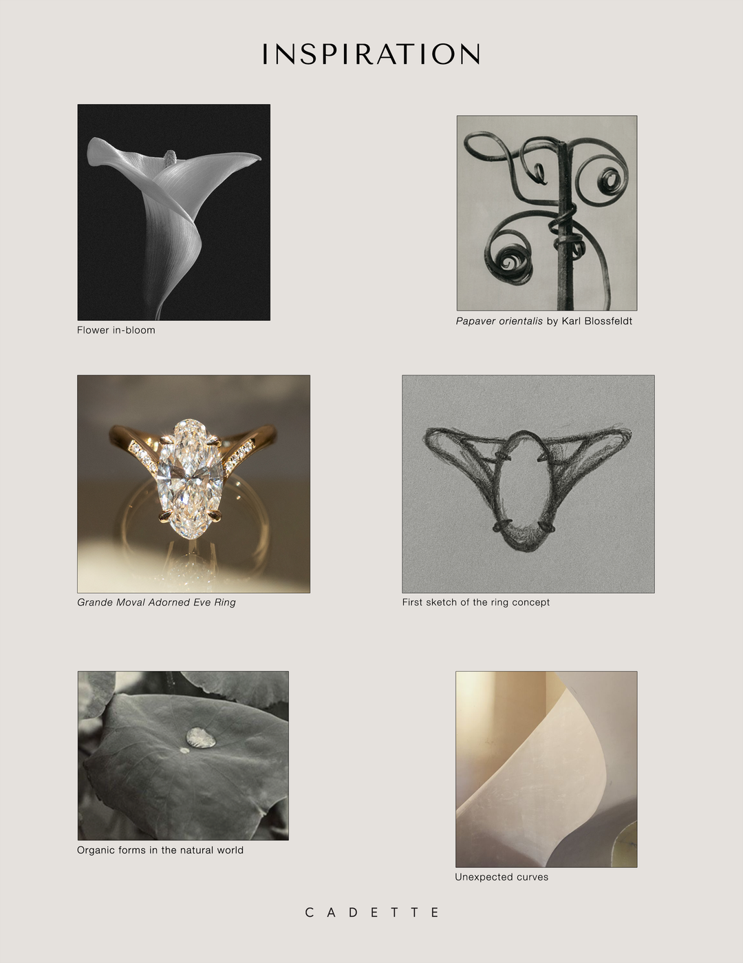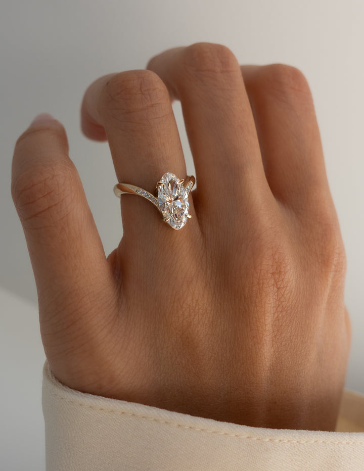 Nature-inspired, the ring’s arching arms emulate a flower in bloom. Each is subtly adorned with pavé-set diamonds, thoughtfully placed to draw the eye toward the centre stone and add a refined shimmer from every angle. The moval diamond symbolizes that blossoming moment, while the band elegantly expresses unfolding petals. A tribute to natural beauty and enduring love.