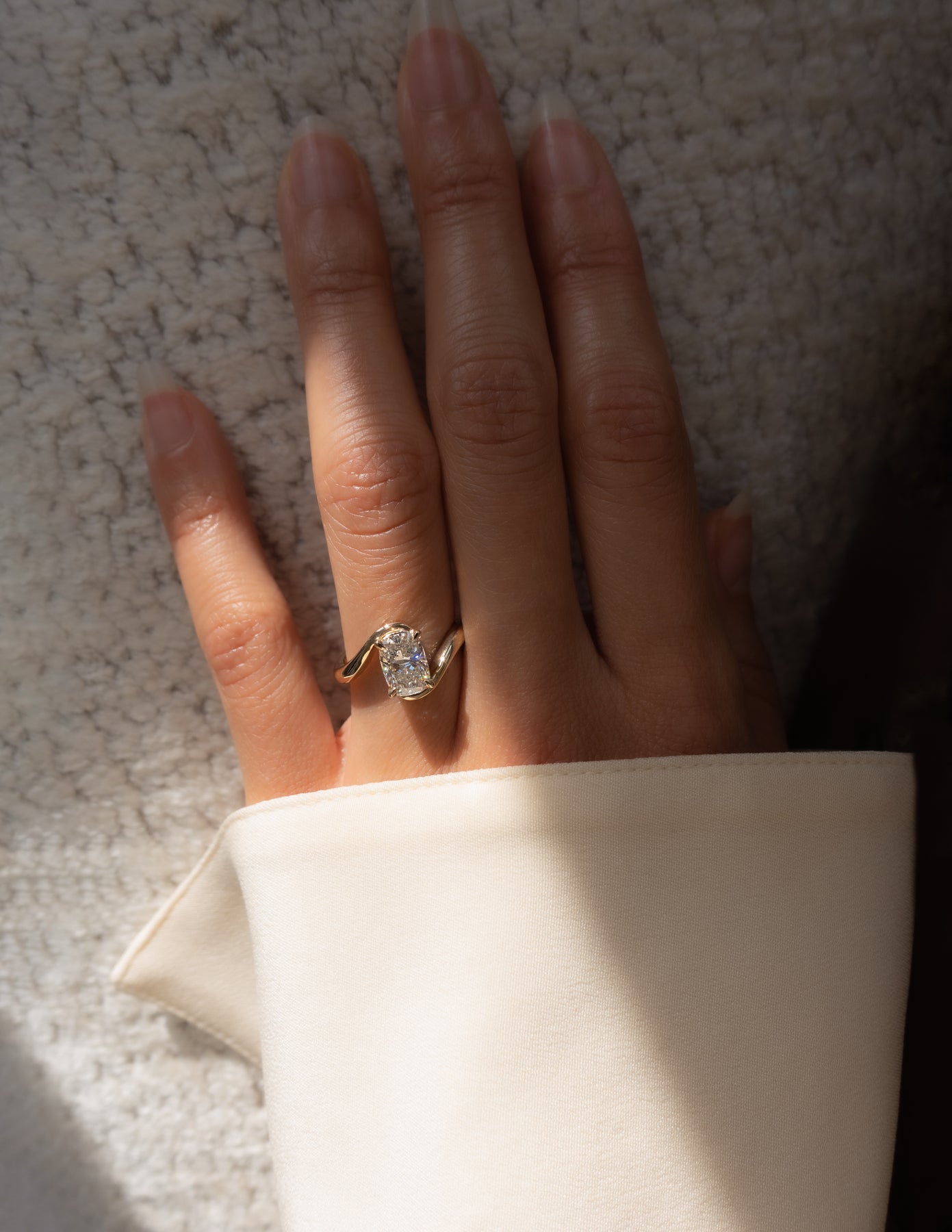 The signature Rapture™ ring showcases a brilliant elongated cushion diamond set in a VERTICAL orientation (north-south) within a sculptural silhouette that expresses the flow and fluidity of water, emulating a wave of rapture. The ring dances elegantly atop your finger as you wear it, radiating a modern timelessness. This ocean-inspired design embraces artful elements of asymmetry and nuance.